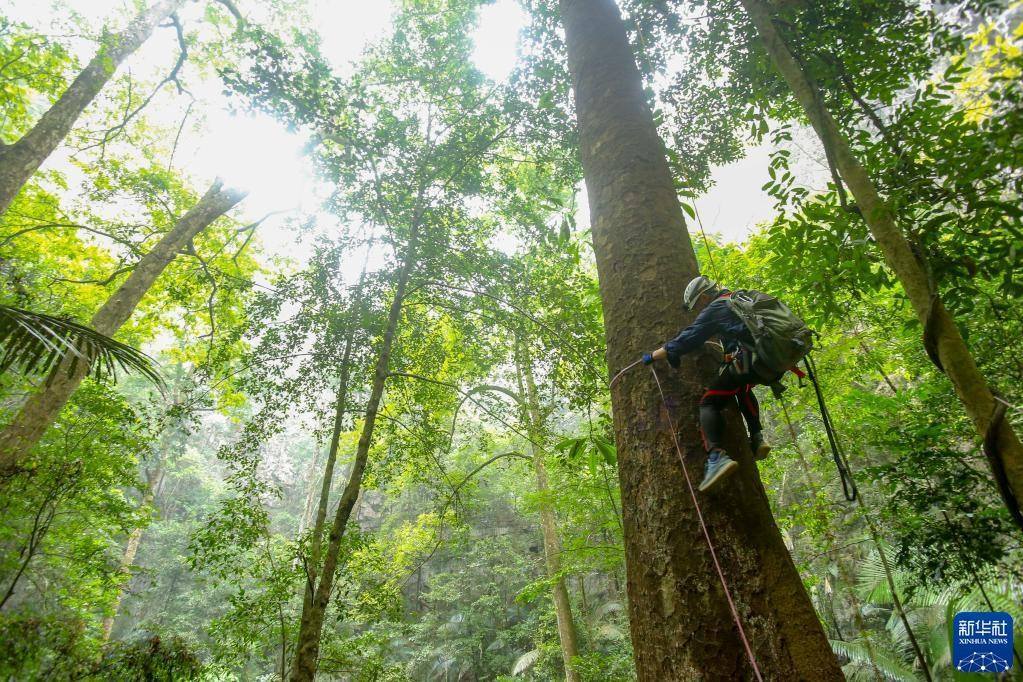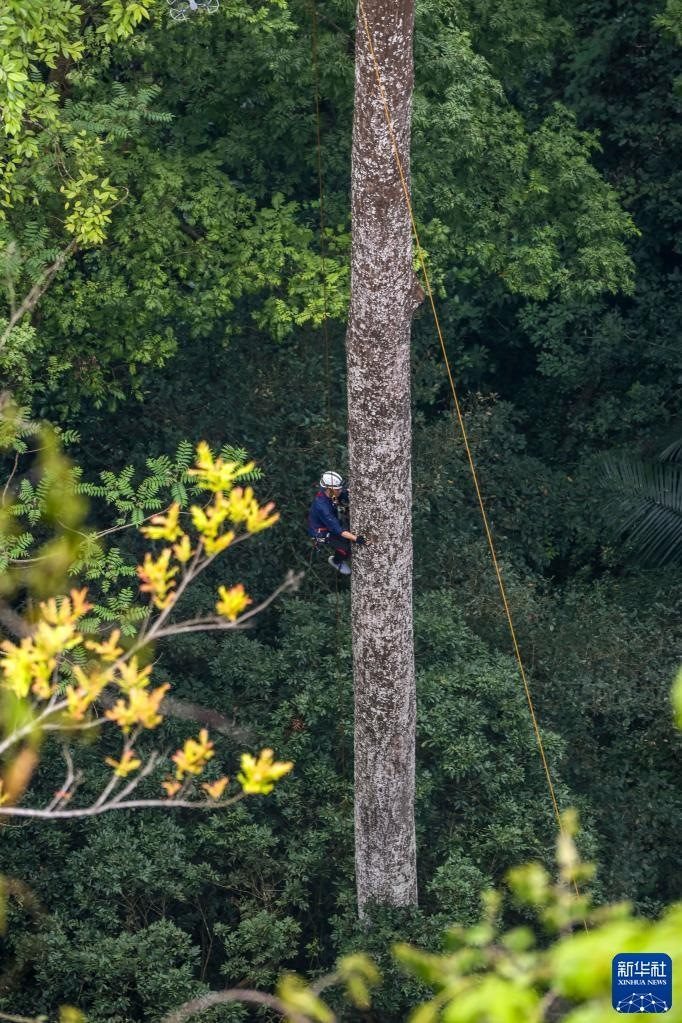 3月15日,南寧藍(lán)天救援隊(duì)的黃賢銘在攀爬望天樹,準(zhǔn)備安裝測量樹高的超聲波信標(biāo)。   新華社發(fā)(農(nóng)正權(quán) 攝)