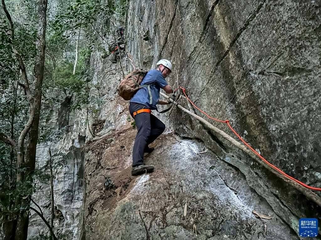 3月15日,聯(lián)合科考隊(duì)成員、廣西植物研究所的王斌在科考途中攀爬巖壁。   新華社發(fā)(徐健 攝)