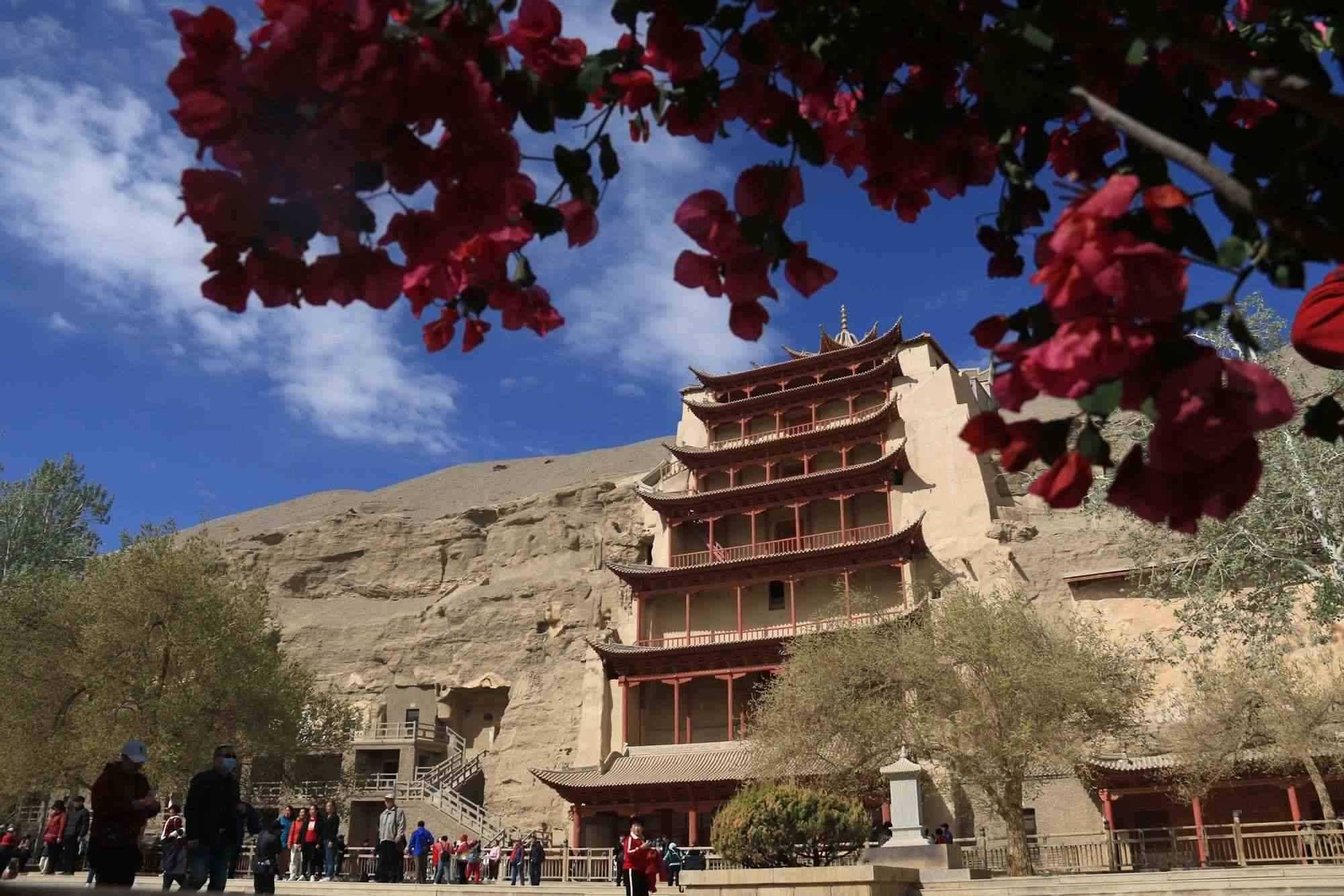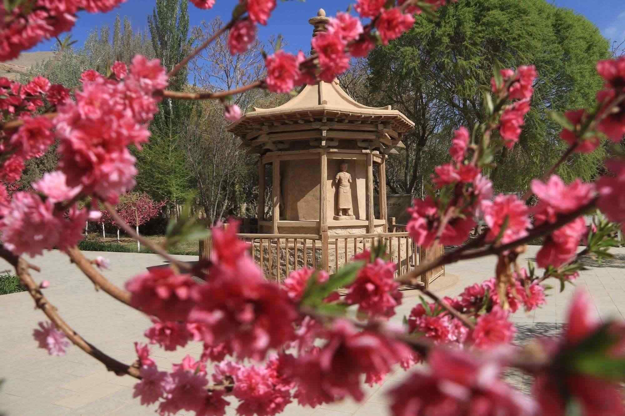 2023年4月27日,甘肅酒泉,敦煌市莫高窟景區(qū)的桃花、三角梅競(jìng)相綻放,游人賞景賞花,樂(lè)在其中。視覺(jué)中國(guó)