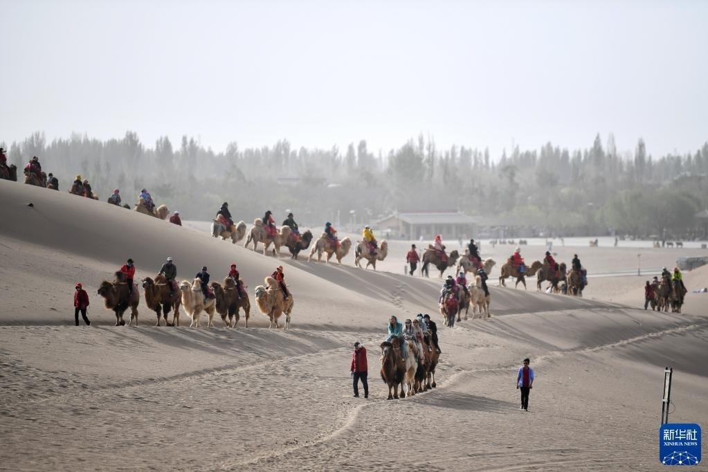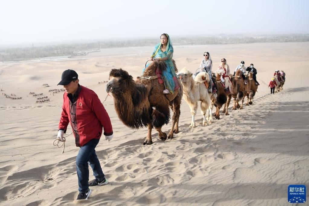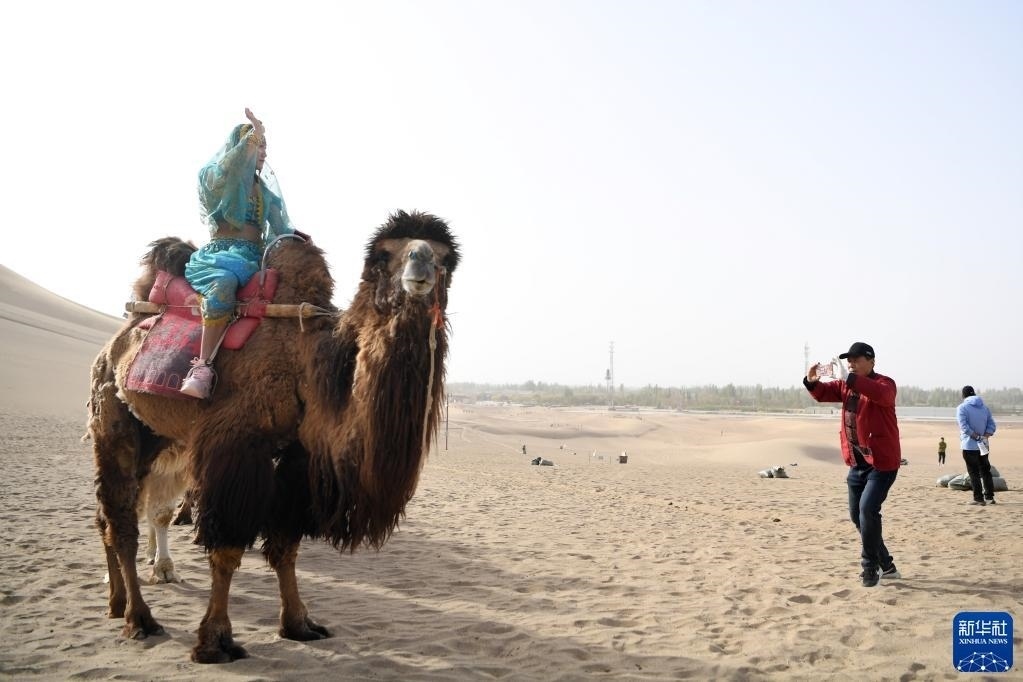 游客騎著駱駝在鳴沙山月牙泉景區(qū)游覽(4月29日攝)。   新華社發(fā)(張曉亮 攝)