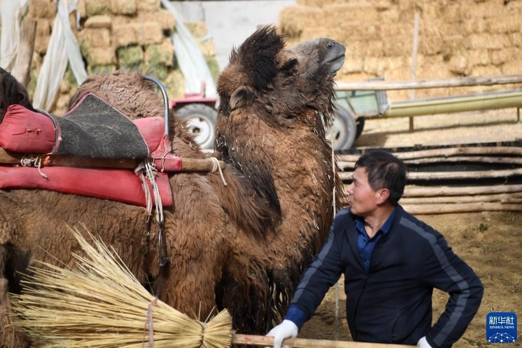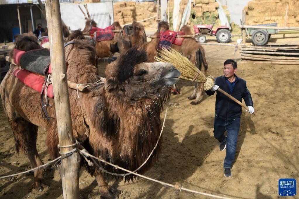 曹文華在駝圈里打掃衛(wèi)生,為駱駝“上班”做準(zhǔn)備(4月24日攝)。   新華社記者 陳斌 攝