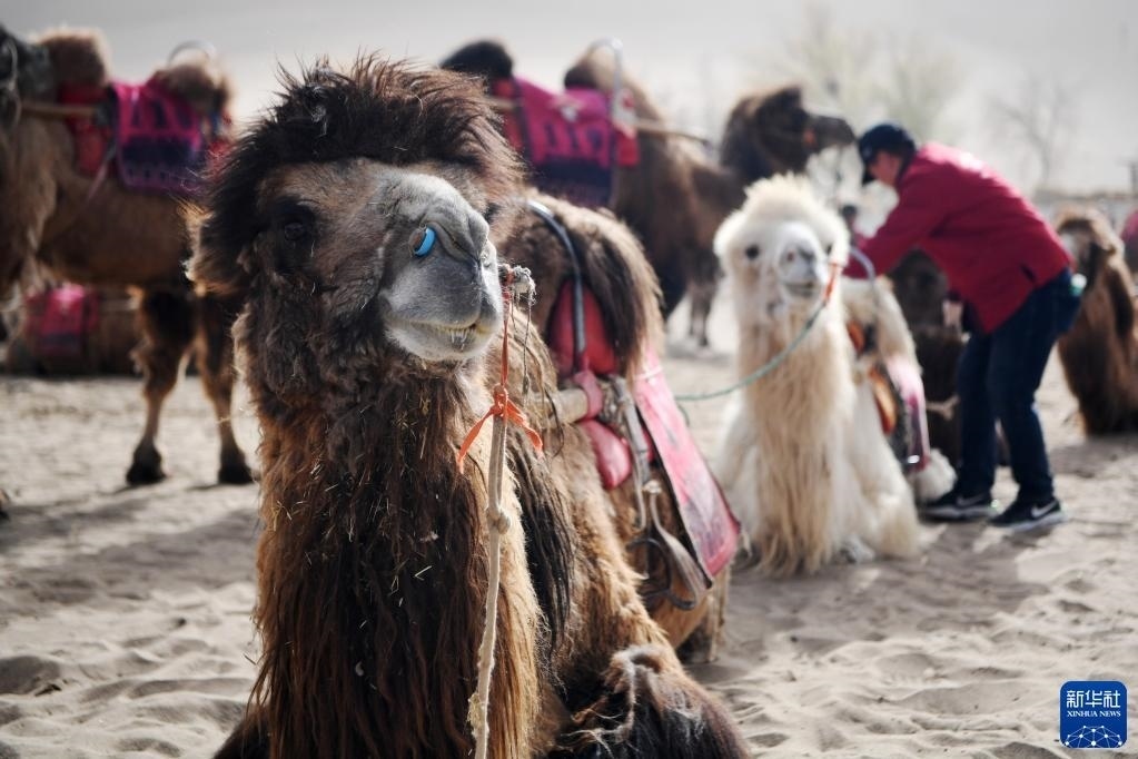 編號“414”的駱駝(前)在鳴沙山月牙泉景區(qū)駱駝騎乘點(diǎn)休息等待游客(4月24日攝)。   新華社記者 陳斌 攝