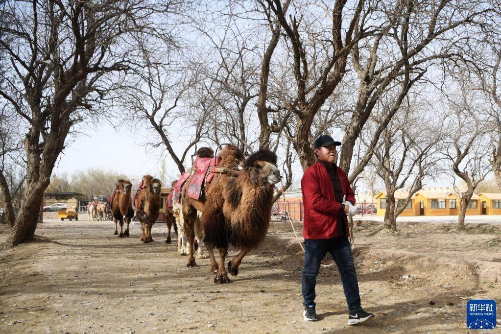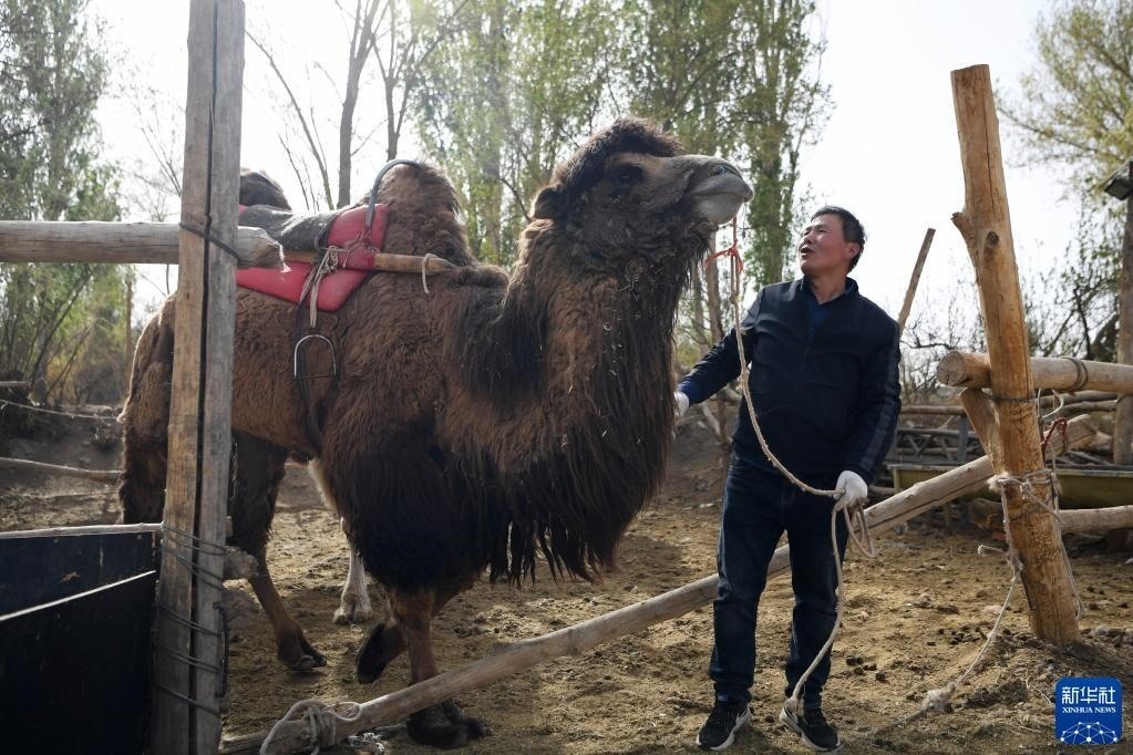 換上景區(qū)工作服的曹文華牽著駱駝準(zhǔn)備“上班”(4月24日攝)。   新華社記者 方欣 攝