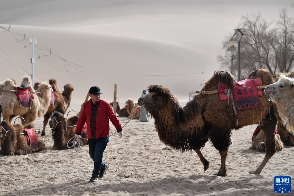 曹文華準(zhǔn)備牽駱駝前往鳴沙山月牙泉景區(qū)(4月24日攝)。   新華社記者 方欣 攝