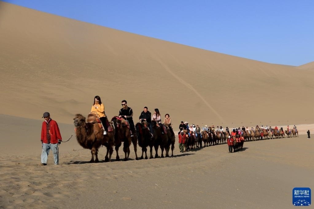 曹文華和他的駝隊(duì)載著游客行走在鳴沙山月牙泉景區(qū)的駝道上(4月24日攝)。   新華社記者 方欣 攝