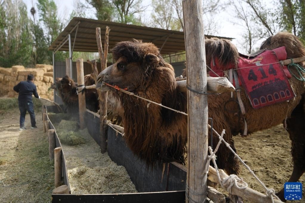 編號“414”的駱駝“上班”前在駝圈里吃草料(4月24日攝)。   新華社記者 陳斌 攝