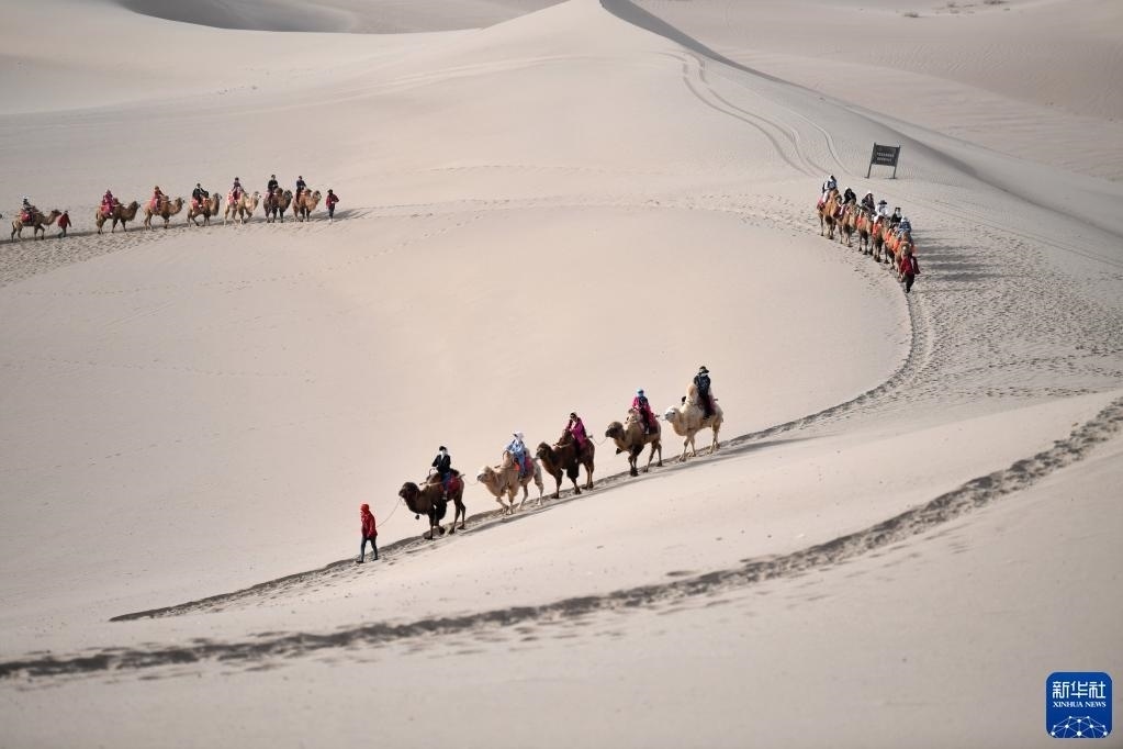 據(jù)介紹,截至4月29日,敦煌市內(nèi)鳴沙山月牙泉等六大景區(qū)今年已累計(jì)接待游客60萬人,同比增長448.72%,比2019年同期增長37.75%。   新華社記者 方欣 攝
