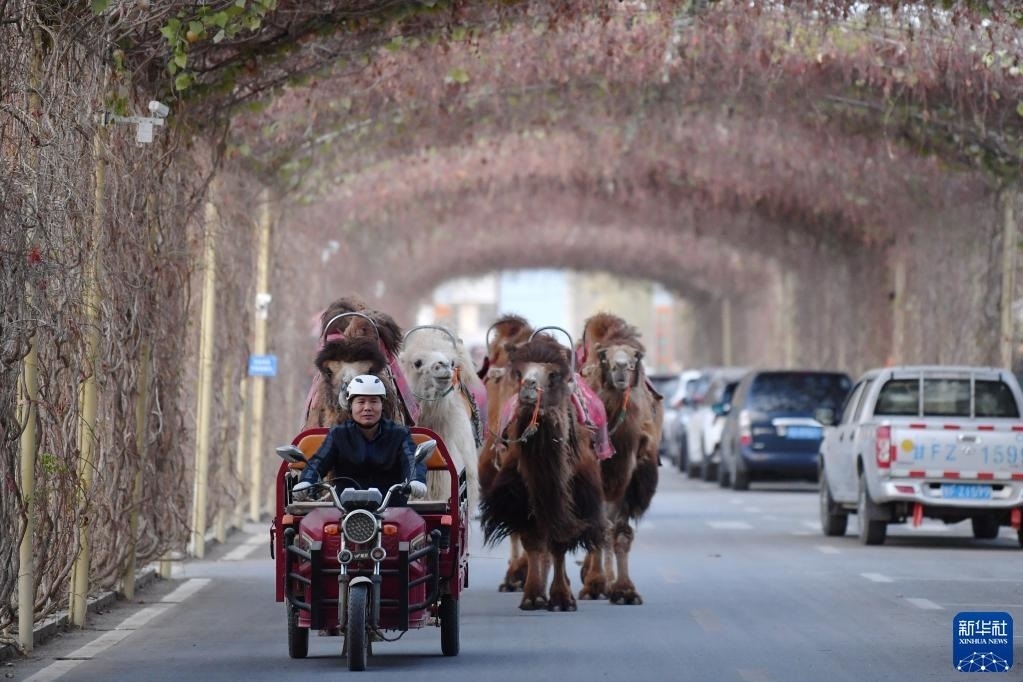 曹文華騎著三輪車帶著駱駝“下班”(4月24日攝)。   新華社記者 方欣 攝
