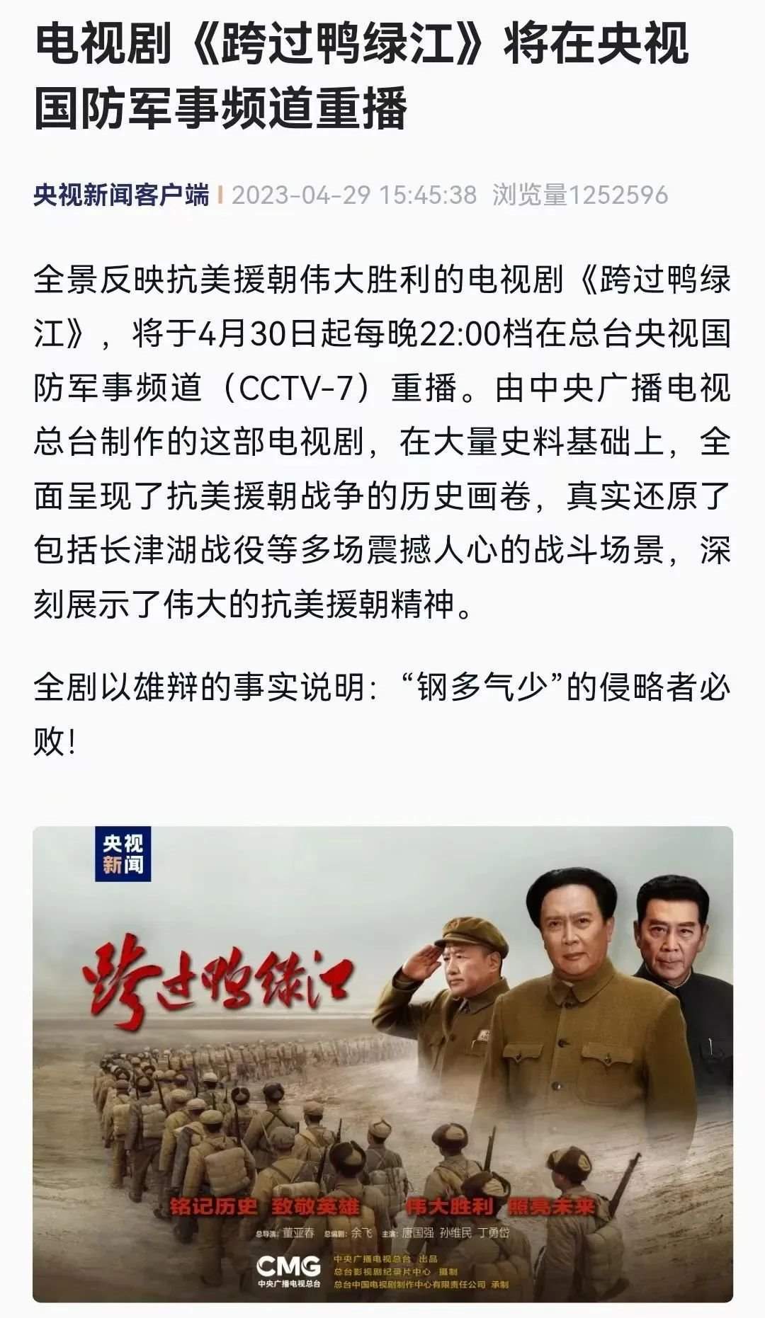 4月29日,中央廣播電視總臺發(fā)布預(yù)告:電視劇《跨過鴨綠江》自4月30日起每晚22點檔在央視國防軍事頻道重播。
