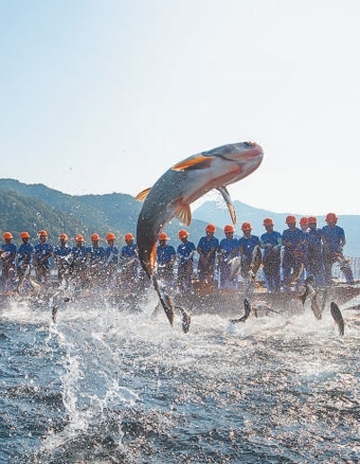 浙江省杭州市淳安縣千島湖國(guó)家級(jí)水產(chǎn)種質(zhì)資源保護(hù)區(qū)內(nèi),漁民在進(jìn)行“巨網(wǎng)捕魚”。謝航凱攝(影像中國(guó))