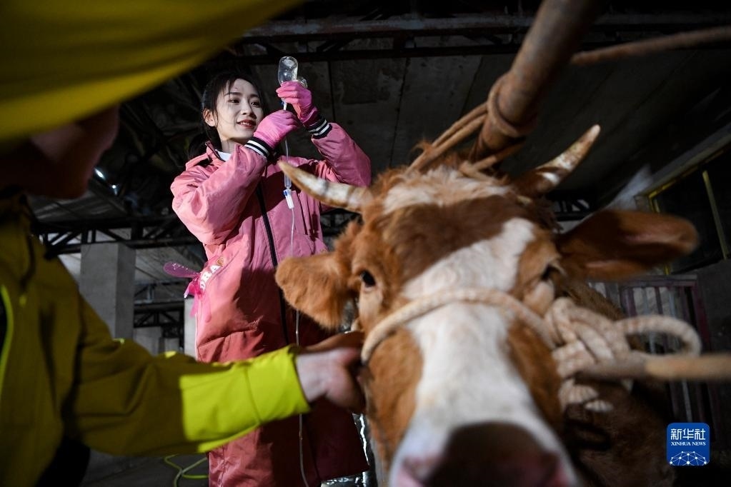 晚上10點多,白婳在固原市原州區(qū)開城鎮(zhèn)和泉村為一頭牛輸液(4月17日攝)。