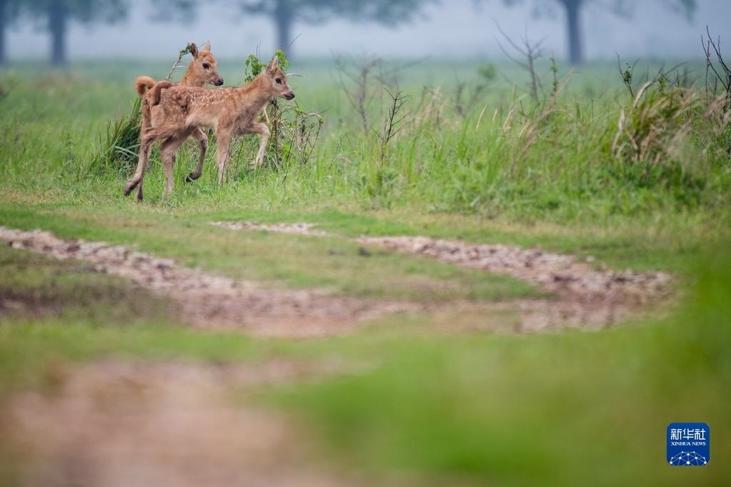 4月28日,幾頭幼鹿跟隨麋鹿群在石首麋鹿國家級自然保護(hù)區(qū)內(nèi)活動。