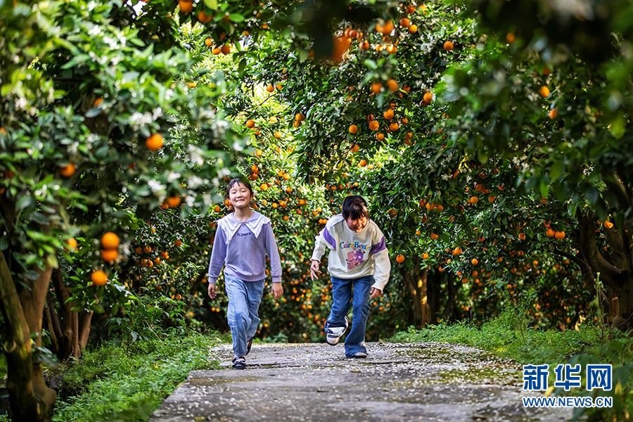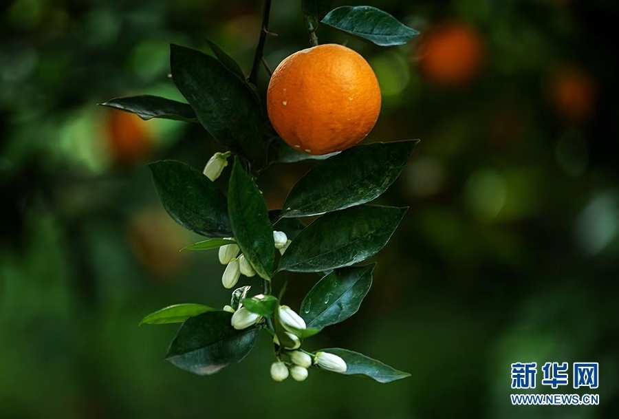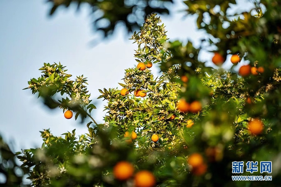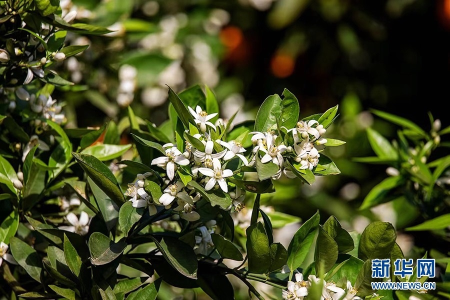 柑橘園里,濃郁的花香隨風(fēng)四溢,金燦燦的柑橘掩映在枝葉中,星星點(diǎn)點(diǎn)的小白花點(diǎn)綴其間,花香和果香交織沁人心脾。新華網(wǎng)發(fā)(余鴻 攝)