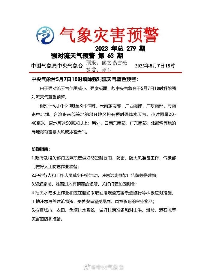 央視網(wǎng)消息:中央氣象臺5月7日18時解除暴雨藍(lán)色預(yù)警和強對流天氣藍(lán)色預(yù)警。