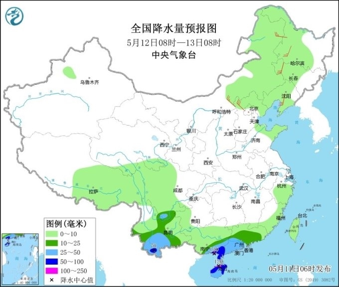 預(yù)計(jì)未來三天(11日至13日),華南地區(qū)仍有較強(qiáng)降雨,廣西、廣東、海南島等地大部地區(qū)日雨量有中到大雨,局地暴雨或大暴雨;此外,云南中南部有中到大雨,局地暴雨。