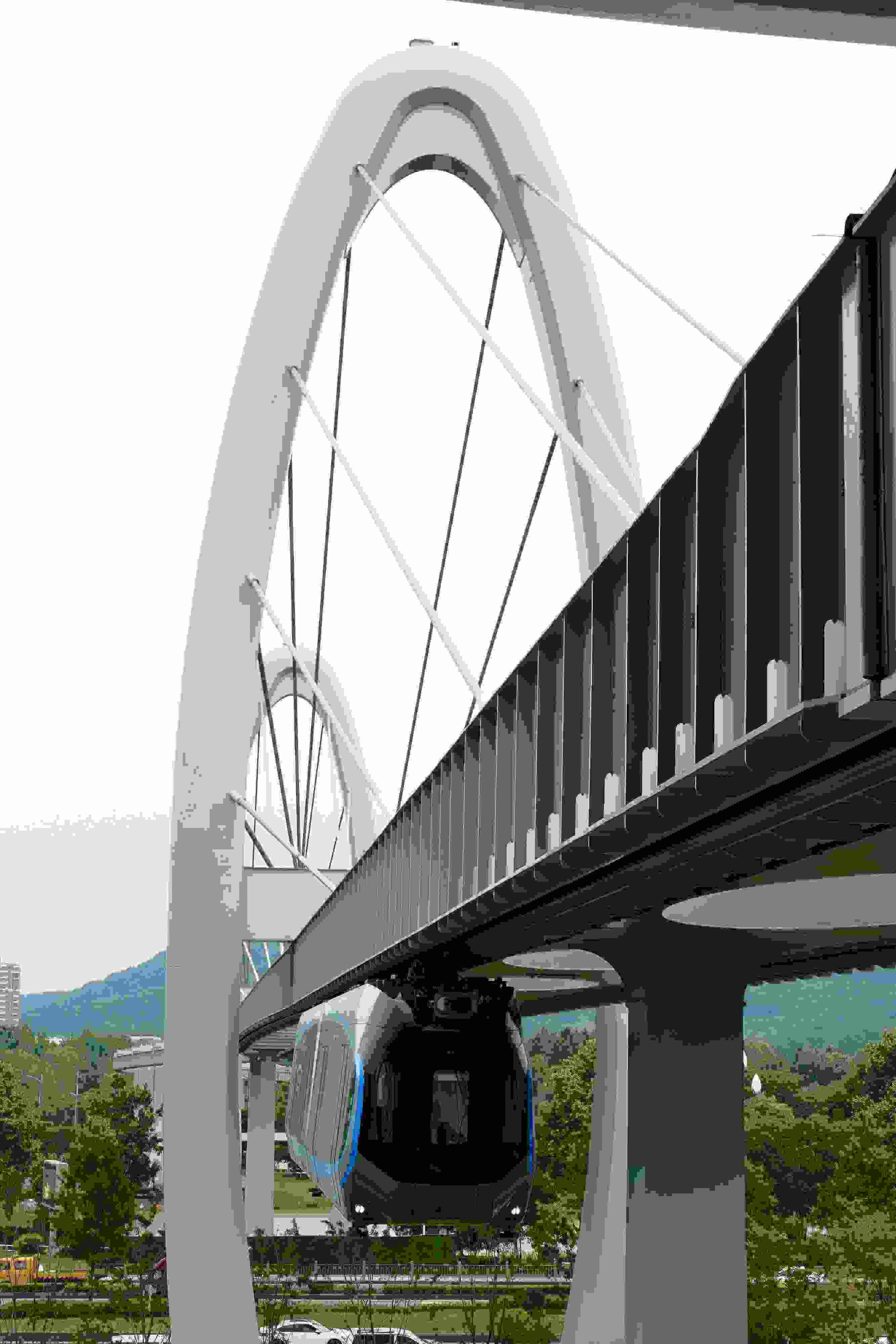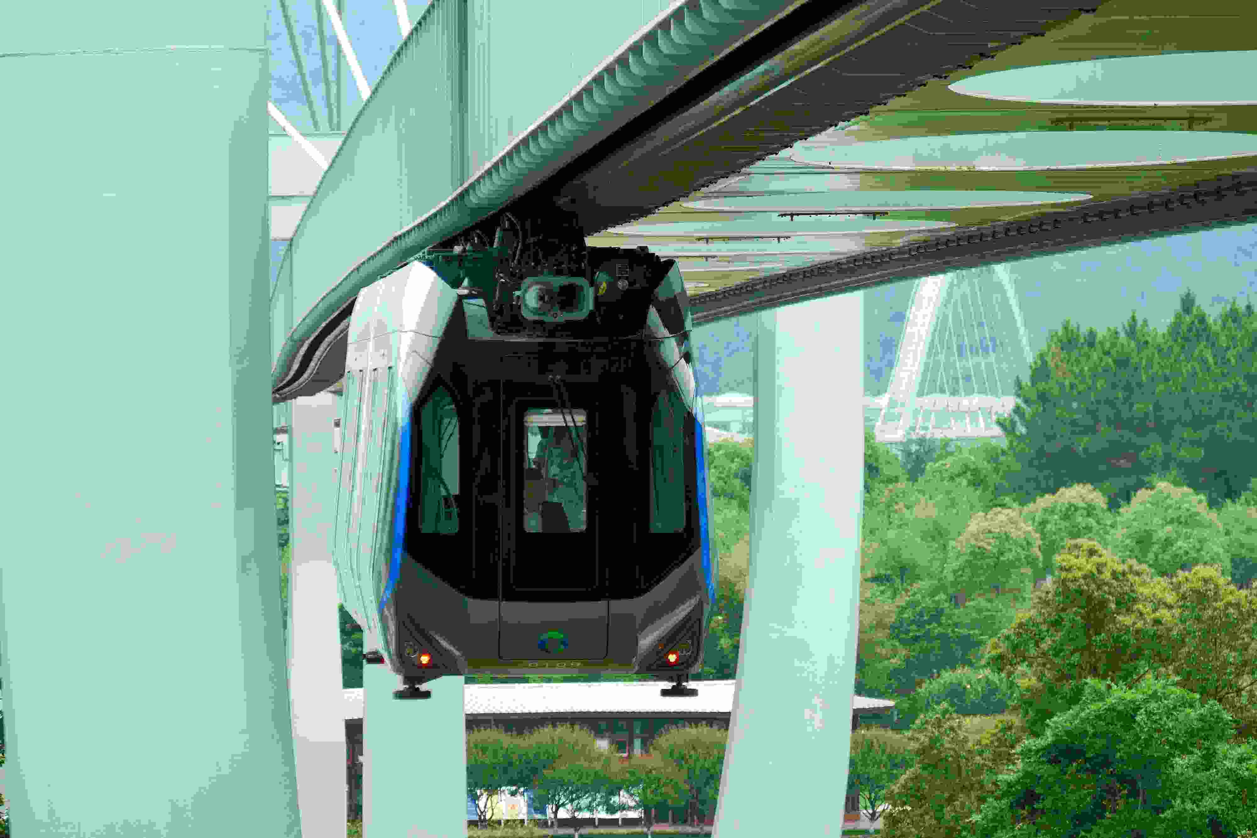 2023年5月11日,武漢,光谷空軌旅游線項(xiàng)目“光谷光子號(hào)”空中軌道列車(chē)在東湖高新區(qū)試跑。武漢光谷空軌旅游線項(xiàng)目位于武漢市東湖高新區(qū)光谷中央生態(tài)大走廊內(nèi),是生態(tài)大走廊旅游配套基礎(chǔ)設(shè)施之一。其規(guī)劃總長(zhǎng)26.7公里,先行建設(shè)的一期工程長(zhǎng)約10.5公里,設(shè)車(chē)站6座。 視覺(jué)中國(guó)