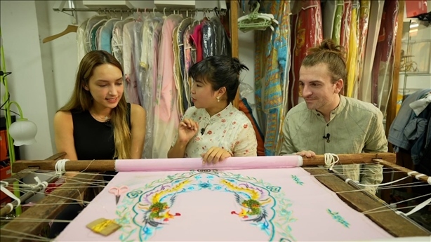 “老板,我是來做戲服模特”“我來考察非遺文化項目”美國的潘明花和意大利徐天佑一起來到狀元坊戲服工廠,戲服刺繡傳承人何鳳婷熱情地講述著戲服刺繡的歷史、制作工序、角色樣式,也讓他們親自體驗(yàn)了刺繡。潘明花驚嘆于刺繡工藝遠(yuǎn)比想象中要復(fù)雜得多。他們穿著戲服走近粵劇博物館,深入了解以粵劇為代表的嶺南文化。徐天佑表示戲服刺繡非遺的傳承不僅是技術(shù)工藝的傳承,同時也是文化的傳承。何鳳婷說如何讓更多年輕人喜愛和關(guān)注這項手藝,如何能繼續(xù)傳承下去是目前亟待解決的問題。為了讓刺繡與現(xiàn)代審美相結(jié)合,老板將刺繡工藝與年輕人喜愛的IP玩偶組合,將“激活非遺+創(chuàng)新思路+文化傳承”理念融入到刺繡中,讓這門手藝更面向大眾,推動非遺的創(chuàng)造性轉(zhuǎn)化,提高與現(xiàn)代生活的緊密度,成為融入現(xiàn)代生活中的潮流元素,讓非遺重?zé)ü獠省?/p>