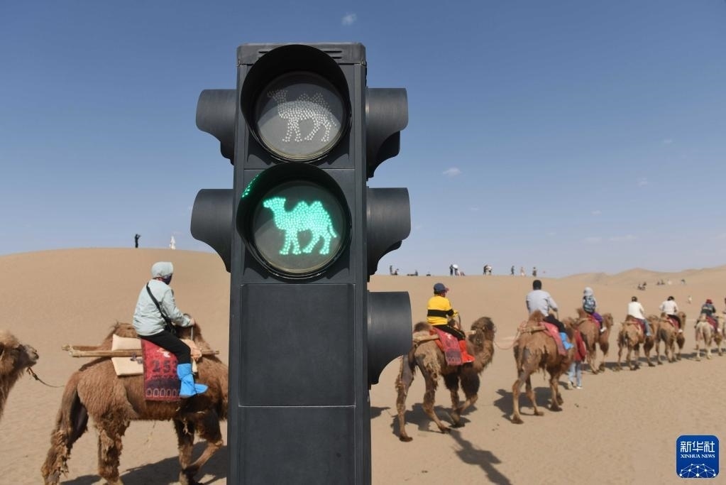 5月11日,在鳴沙山月牙泉景區(qū),游客乘坐的駱駝隊根據(jù)“駱駝紅綠燈”有序通過路口。