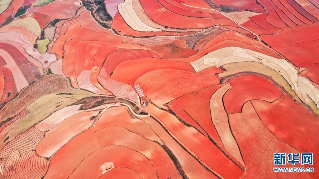 云南省尋甸回族彝族自治縣,連綿不斷的旱梯田遍布山間,遠(yuǎn)接天邊,每年4-5月,經(jīng)過村民翻新、平整后的紅褐色土地,從空中俯瞰五彩斑斕、蔚為壯觀。當(dāng)?shù)卮迕裥燎诟旁诜饰值募t土地上,用勤勞的雙手,繪就一幅幅勞動(dòng)藝術(shù)畫作。新華網(wǎng)發(fā)(孫文來 攝影報(bào)道)