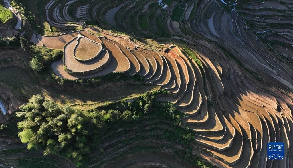 5月18日拍攝的晨光映照下的紫鵲界梯田(無人機(jī)照片)。