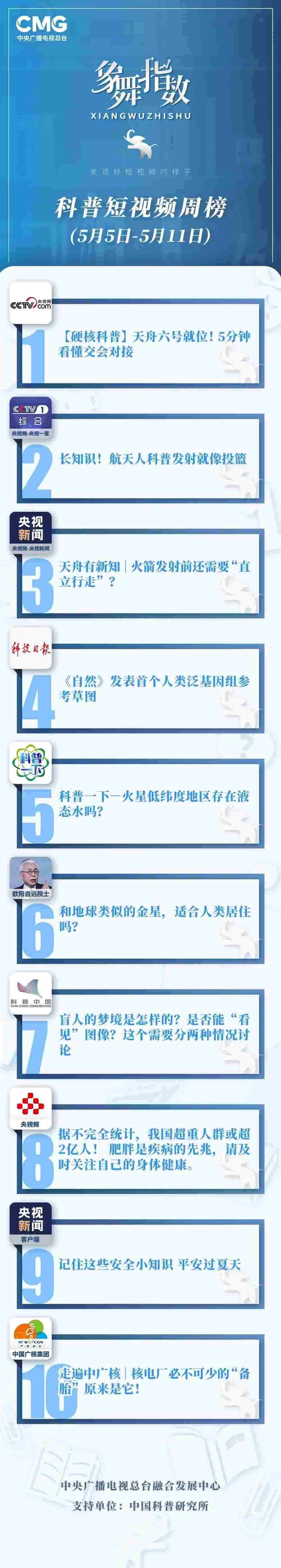 象舞指數(shù)|科普短視頻周榜(5月5日—5月11日)