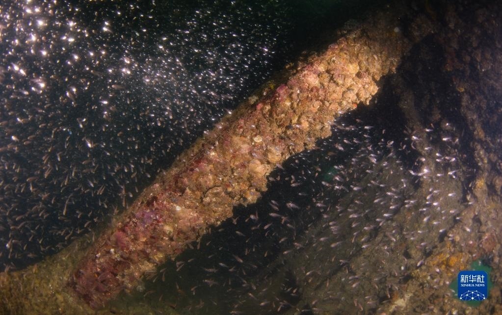 這是在蜈支洲島海域海洋牧場(chǎng)沉船魚礁內(nèi)拍攝的魚群(5月16日攝)。   新華社記者 楊冠宇 攝