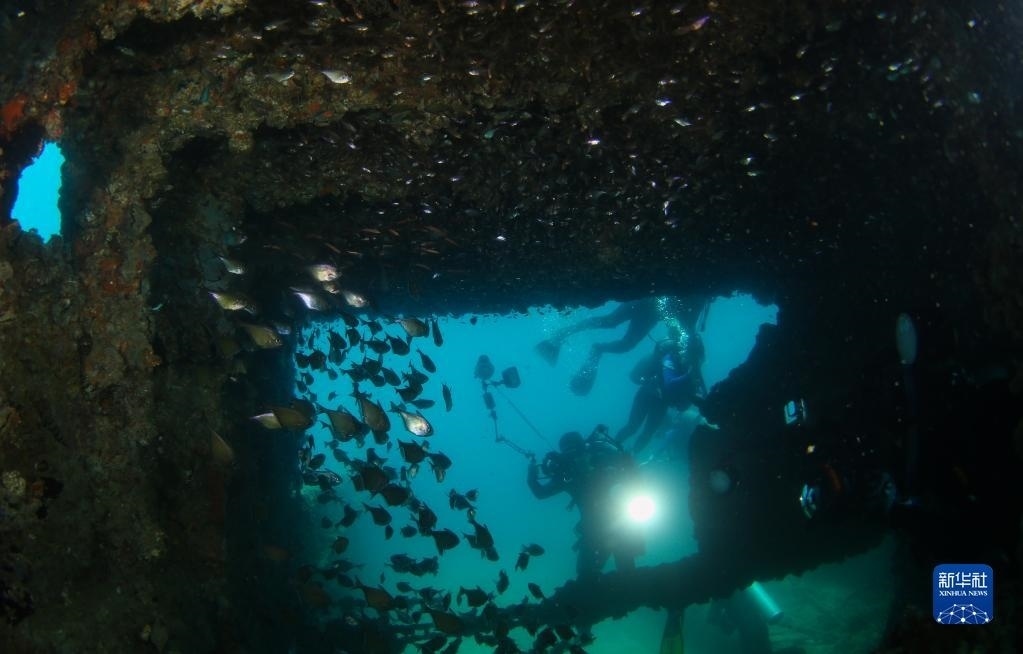 攝影愛(ài)好者在蜈支洲島海域海洋牧場(chǎng)拍攝沉船魚礁內(nèi)的魚群(2021年5月21日攝)。   新華社記者 楊冠宇 攝