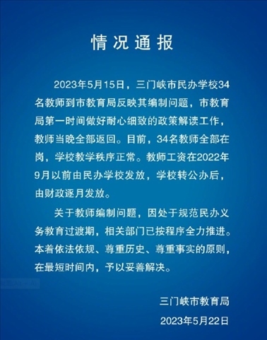 ·三門峽通報(bào)“34名教師反映編制4年未解決”:目前全部在崗,將妥善解決問題。