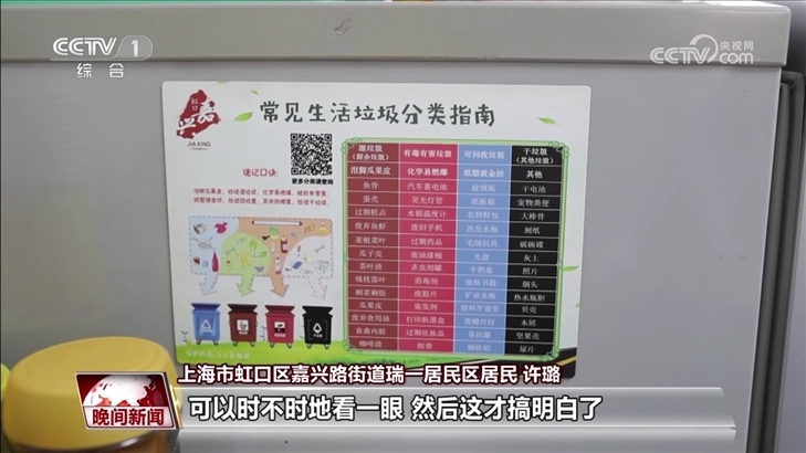 上海市虹口區(qū)嘉興路街道瑞一居民區(qū)居民 許璐:剛開始我們也搞不明白什么算是濕垃圾,什么算是干垃圾,然后看了小冊(cè)子,看了一些廣告,看還有冰箱貼,天天貼著那個(gè)上頭,可以時(shí)不時(shí)地看一眼,然后這才搞明白了。