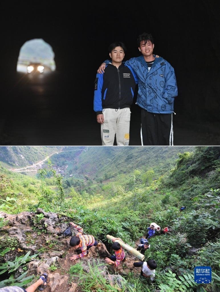 拼版照片:上圖為2023年1月20日,在大化瑤族自治縣板升鄉(xiāng)弄勇村,22歲的蒙宣任(左)和弟弟蒙宣汰站在通往弄勇小學(xué)的隧道旁合影,隧道上方是他們兒時(shí)上學(xué)需要攀爬的“天梯”;下圖為2012年9月3日,在大化瑤族自治縣板升鄉(xiāng)弄勇村,蒙宣汰(左一)、蒙宣任(左二)爬山路去學(xué)校。蒙宣任目前在遼寧省交通高等專科學(xué)校讀書,弟弟蒙宣汰從技校畢業(yè)后在廣東一家汽修廠上班。