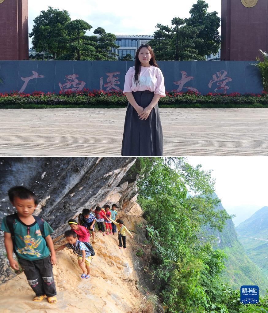 拼版照片:上圖為2023年5月27日,22歲的蒙秋艷站在她就讀的廣西醫(yī)科大學(xué)校門口(新華社發(fā));下圖為2012年9月3日,在大化瑤族自治縣板升鄉(xiāng)弄雷村哈保屯,11歲的蒙秋艷(右一)在懸崖邊護(hù)著低年級(jí)的小伙伴回家(新華社記者黃孝邦攝)。2021年,蒙秋艷以優(yōu)異的成績(jī),考取廣西醫(yī)科大學(xué)。