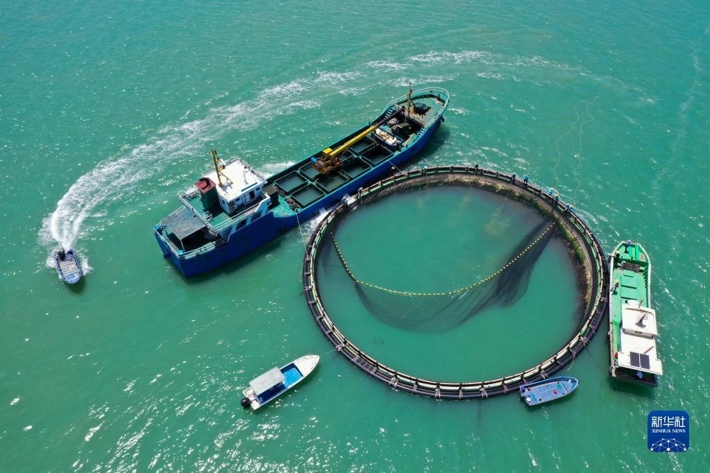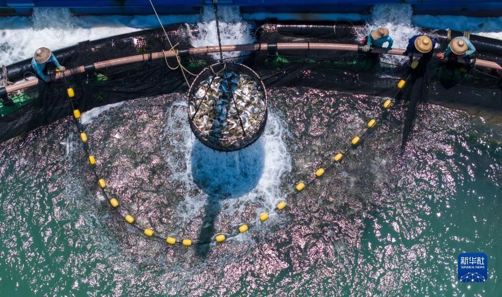 5月27日,在湛江市徐聞縣西連鎮(zhèn),漁業(yè)工人從徐聞國(guó)橋深海養(yǎng)殖有限公司的金鯧魚(yú)深海網(wǎng)箱捕魚(yú)(無(wú)人機(jī)照片)。