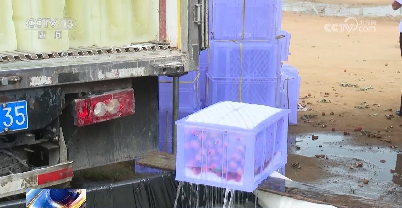 這邊采購商前腳剛走,梁康連就來到荔枝分揀打包中心?,F(xiàn)在這里剛采摘下來的荔枝,分選打包后,要放到冰水里浸泡一個小時以上,再裝上冷鏈車物流運輸保證荔枝的新鮮度。