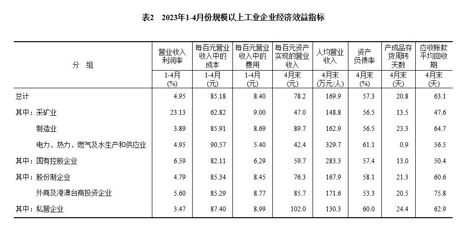 4月末,規(guī)模以上工業(yè)企業(yè)每百元資產(chǎn)實(shí)現(xiàn)的營(yíng)業(yè)收入為78.2元,同比減少5.6元;人均營(yíng)業(yè)收入為169.9萬(wàn)元,同比增加6.2萬(wàn)元;產(chǎn)成品存貨周轉(zhuǎn)天數(shù)為20.8天,同比增加1.3天;應(yīng)收賬款平均回收期為63.1天,同比增加6.4天。