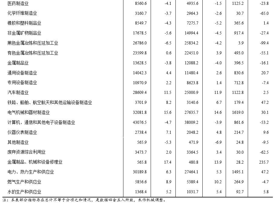 1—4月份,在41個(gè)工業(yè)大類行業(yè)中,13個(gè)行業(yè)利潤(rùn)總額同比增長(zhǎng),1個(gè)行業(yè)持平,27個(gè)行業(yè)下降。主要行業(yè)利潤(rùn)情況如下:電力、熱力生產(chǎn)和供應(yīng)業(yè)利潤(rùn)總額同比增長(zhǎng)47.2%,電氣機(jī)械和器材制造業(yè)增長(zhǎng)30.1%,通用設(shè)備制造業(yè)增長(zhǎng)20.7%,汽車制造業(yè)增長(zhǎng)2.5%,石油和天然氣開采業(yè)下降6.0%,專用設(shè)備制造業(yè)下降7.4%,煤炭開采和洗選業(yè)下降14.6%,非金屬礦物制品業(yè)下降27.4%,紡織業(yè)下降30.2%,農(nóng)副食品加工業(yè)下降36.3%,計(jì)算機(jī)、通信和其他電子設(shè)備制造業(yè)下降53.2%,有色金屬冶煉和壓延加工業(yè)下降55.1%,化學(xué)原料和化學(xué)制品制造業(yè)下降57.3%,石油、煤炭及其他燃料加工業(yè)下降87.9%,黑色金屬冶煉和壓延加工業(yè)下降99.4%。