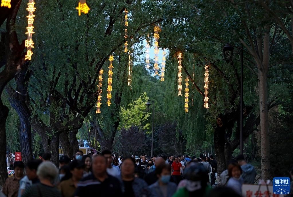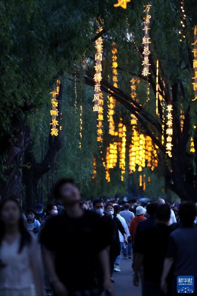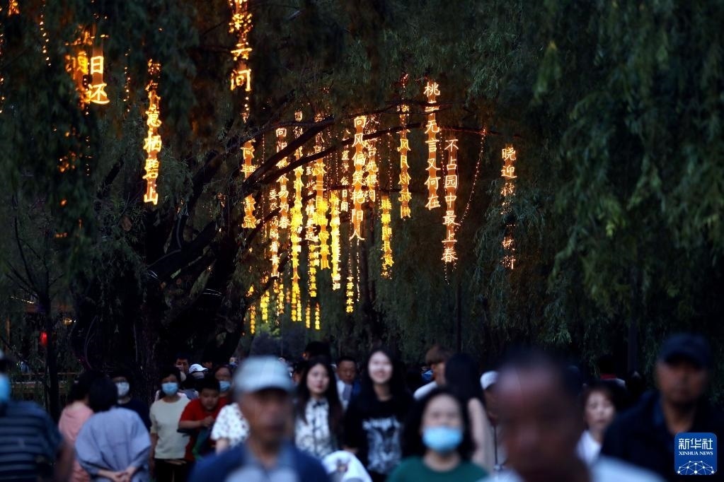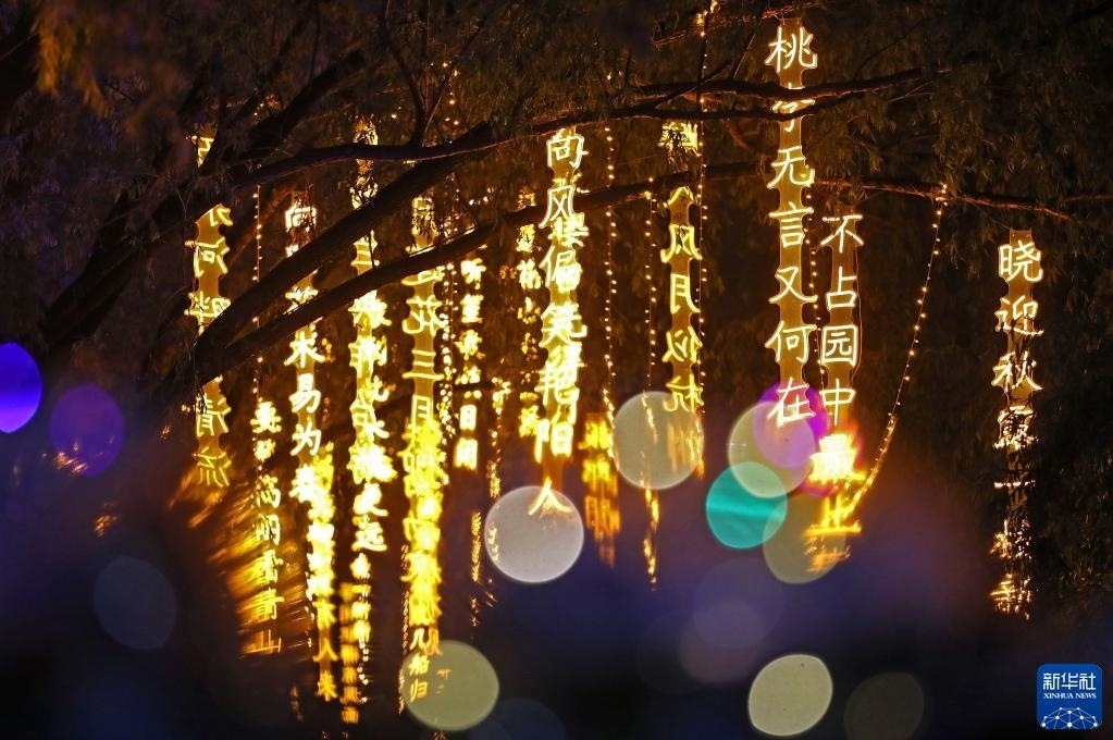近日,沈陽市萬泉公園打造的一條詩詞漫道成為游客和市民的網(wǎng)紅打卡地。每當(dāng)夜幕降臨,幾十首古詩詞彩燈在這條300余米道路的樹梢枝頭熠熠閃爍,以詩入景,一步一詩。新華社記者 姚劍鋒 攝