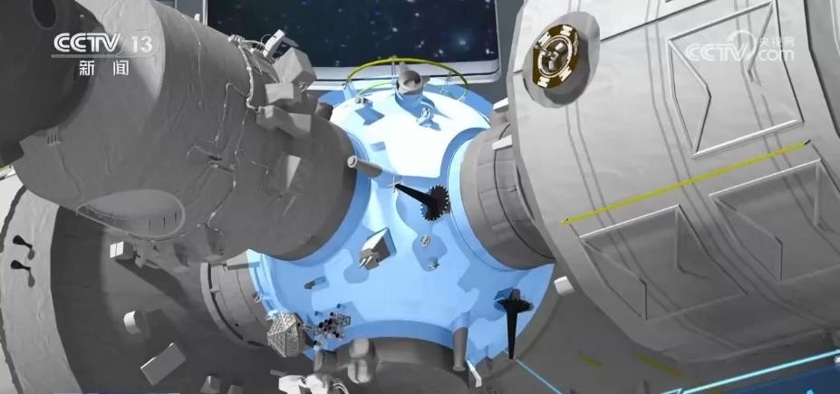 我們通過虛擬演示從“外邊”了解了航天員如何從飛船進入空間站。再通過動畫和上次兩個乘組會師的畫面,從“里邊”看一下這個過程。