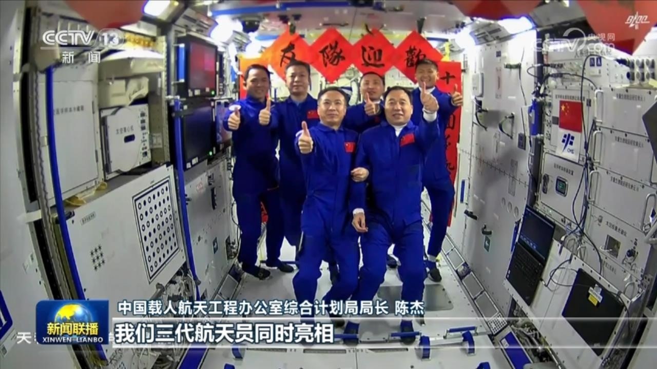 18時22分,神舟十五號航天員乘組順利打開“家門”,歡迎遠道而來的神舟十六號航天員乘組入駐“天宮”。