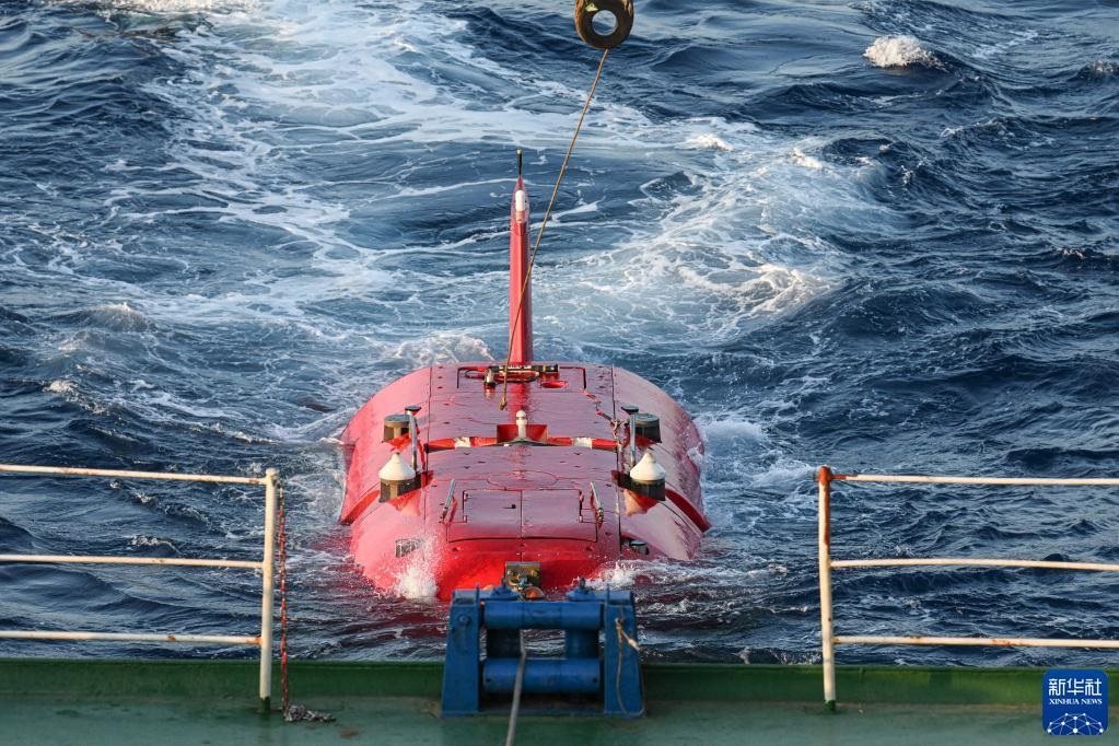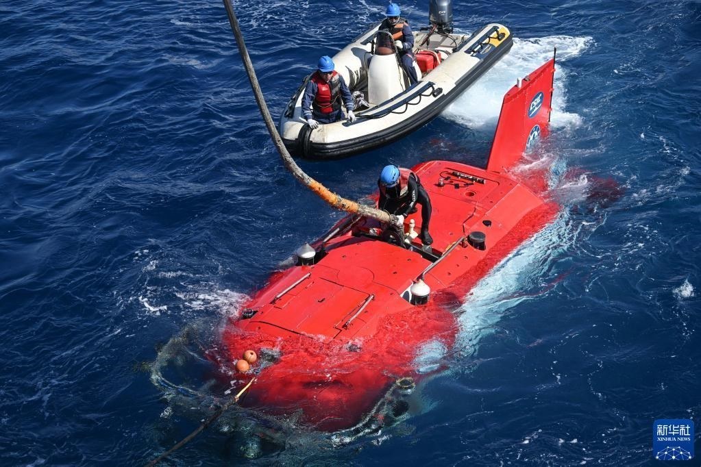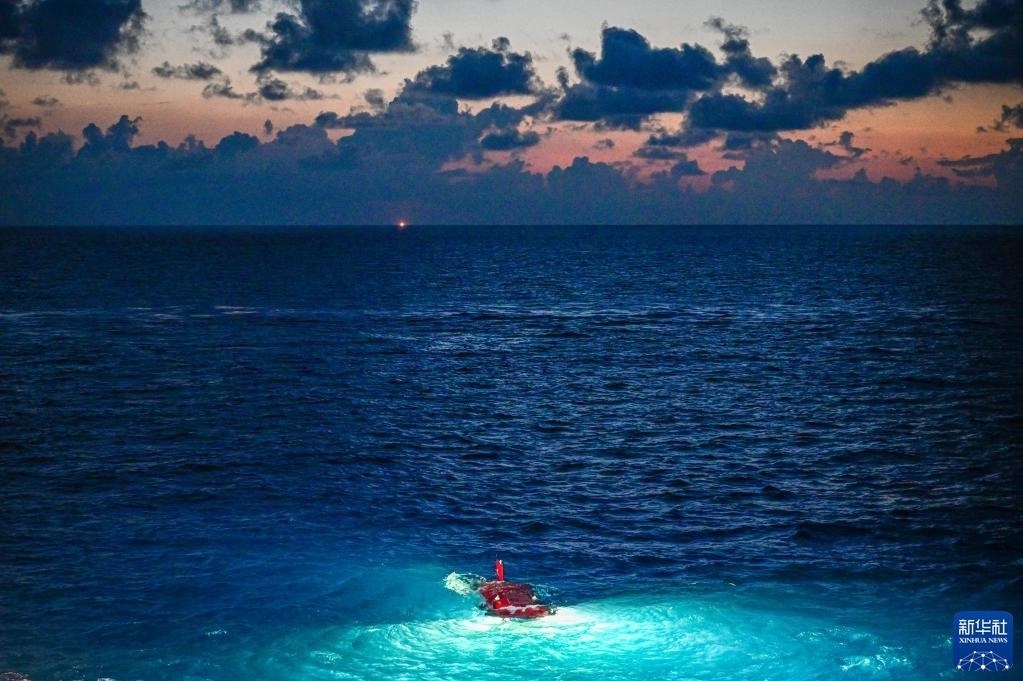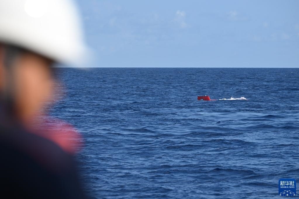 在結束當日的水下調查后,搭載著考古隊員的“深海勇士”號載人潛水器浮出海面(5月27日攝)。   新華社記者 蒲曉旭 攝