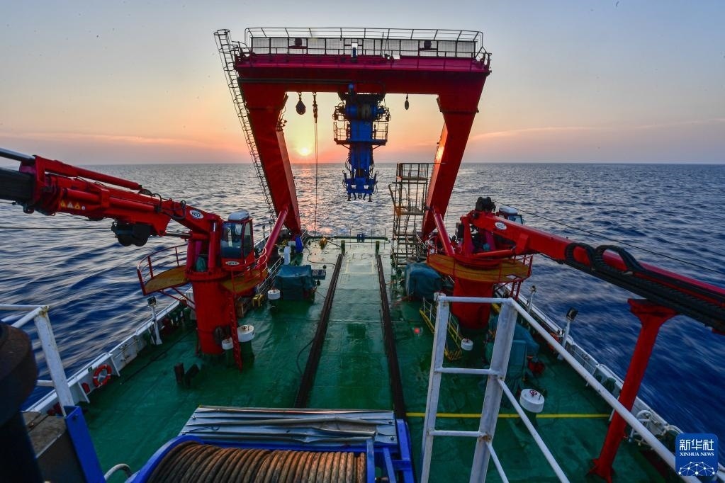 “深海勇士”號載人潛水器即將下潛開始當日的水下調查(5月27日攝)。   新華社記者 蒲曉旭 攝