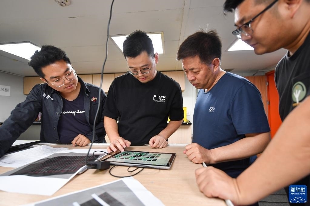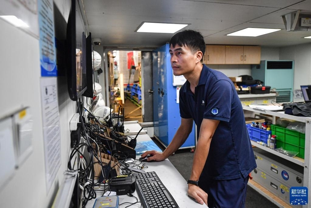潛航員在“探索一號”科考船上整理從水下采集的考古數據(5月25日攝)。   新華社記者 蒲曉旭 攝
