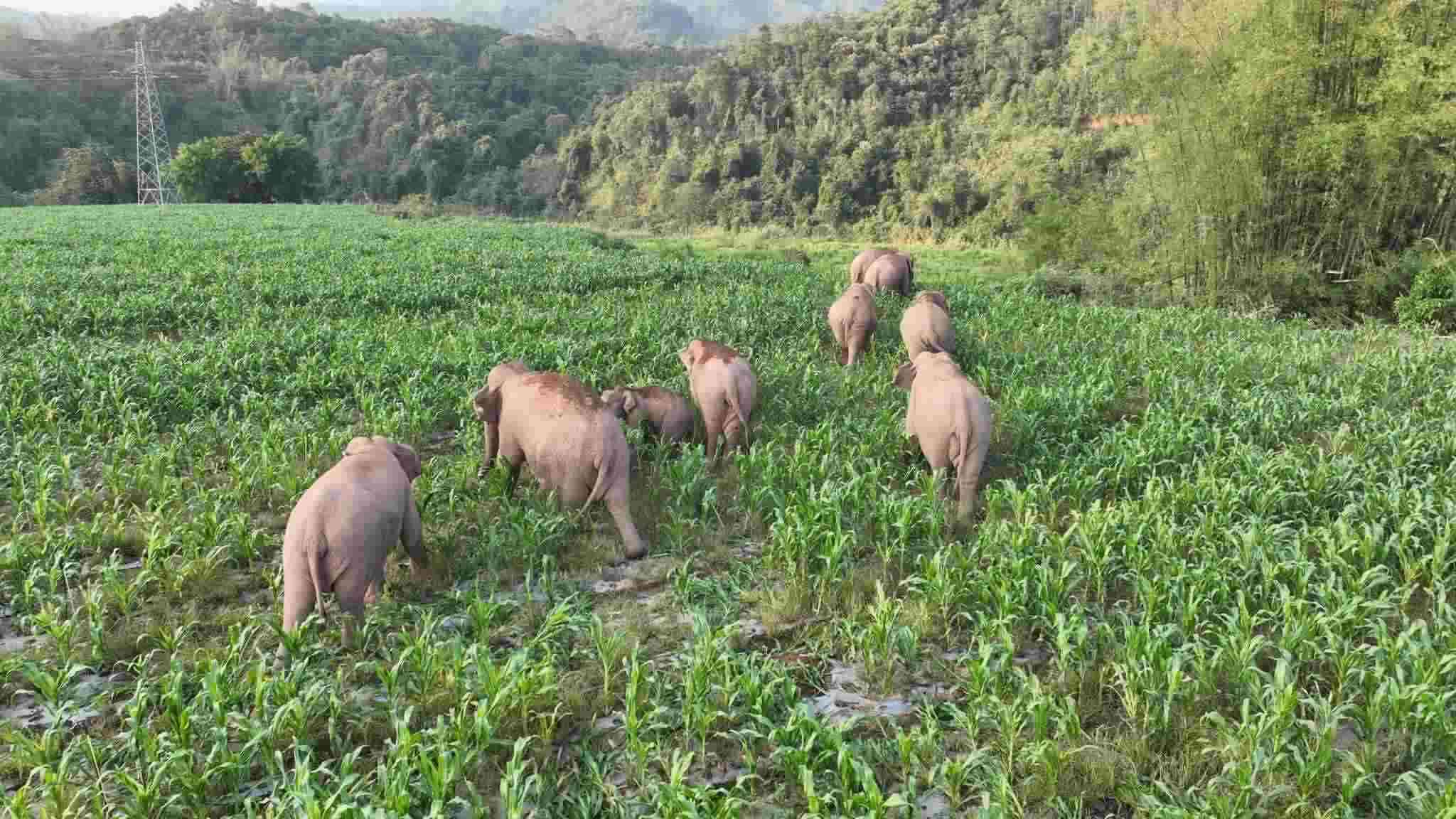 2023年5月17日,云南普洱,亞洲象群出山覓食戲水。視覺中國