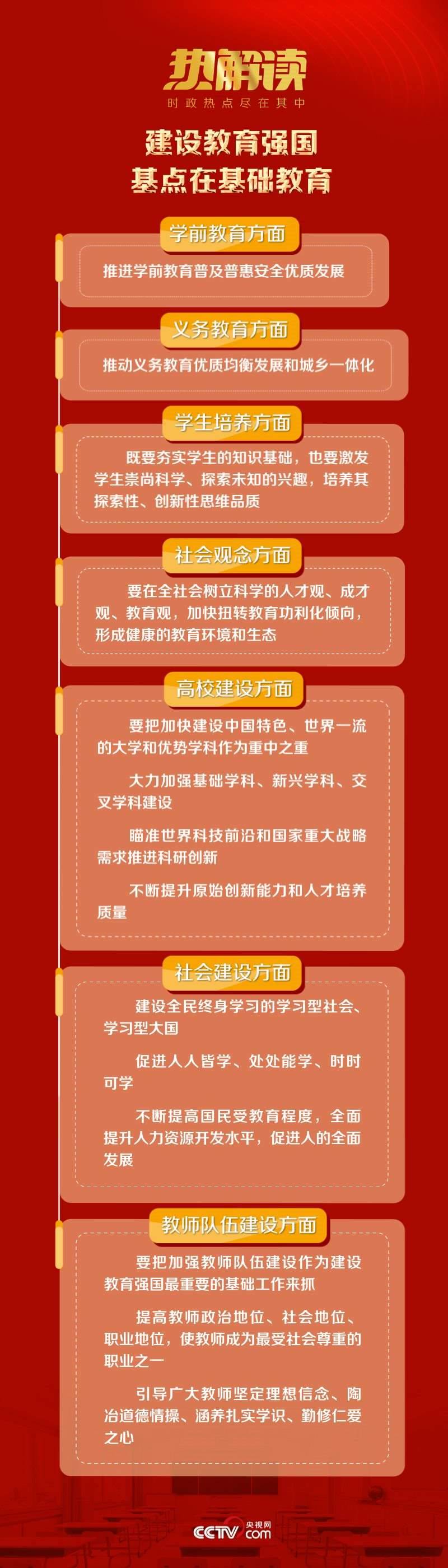 學前教育普及普惠安全優(yōu)質(zhì)發(fā)展;義務(wù)教育優(yōu)質(zhì)均衡發(fā)展和城鄉(xiāng)一體化;在全社會樹立科學的人才觀、成才觀、教育觀……這些始終是總書記關(guān)心的重點。做什么、怎么做,總書記明確給出了推動基礎(chǔ)教育、加快建設(shè)高質(zhì)量教育體系的方法路徑。