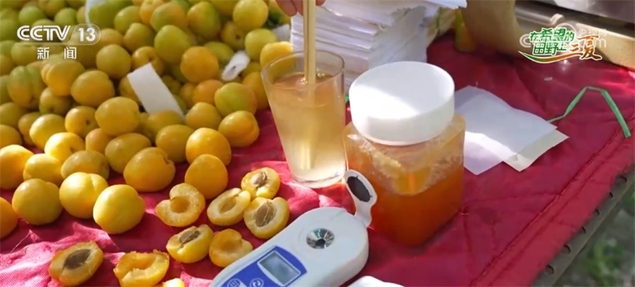 其實(shí)輪臺(tái)白杏在新疆本地也是非常有口碑的。大家知道嗎?輪臺(tái)白杏在當(dāng)?shù)匾脖环Q作是“白色蜂蜜”,那它到底擔(dān)不擔(dān)得起這個(gè)稱號(hào)?我們今天在現(xiàn)場給大家?guī)砹艘粋€(gè)小的試驗(yàn),這是一杯白水加了三勺蜂蜜,可以看到它已經(jīng)是蜂蜜水的顏色了,我們通過測(cè)糖儀來測(cè)一下蜂蜜水的糖度,17度。那我們來測(cè)一下我們剛才嘗的這個(gè)輪臺(tái)白杏,擠一些它的汁液出來,16度,已經(jīng)非常接近蜂蜜水的甜度了。