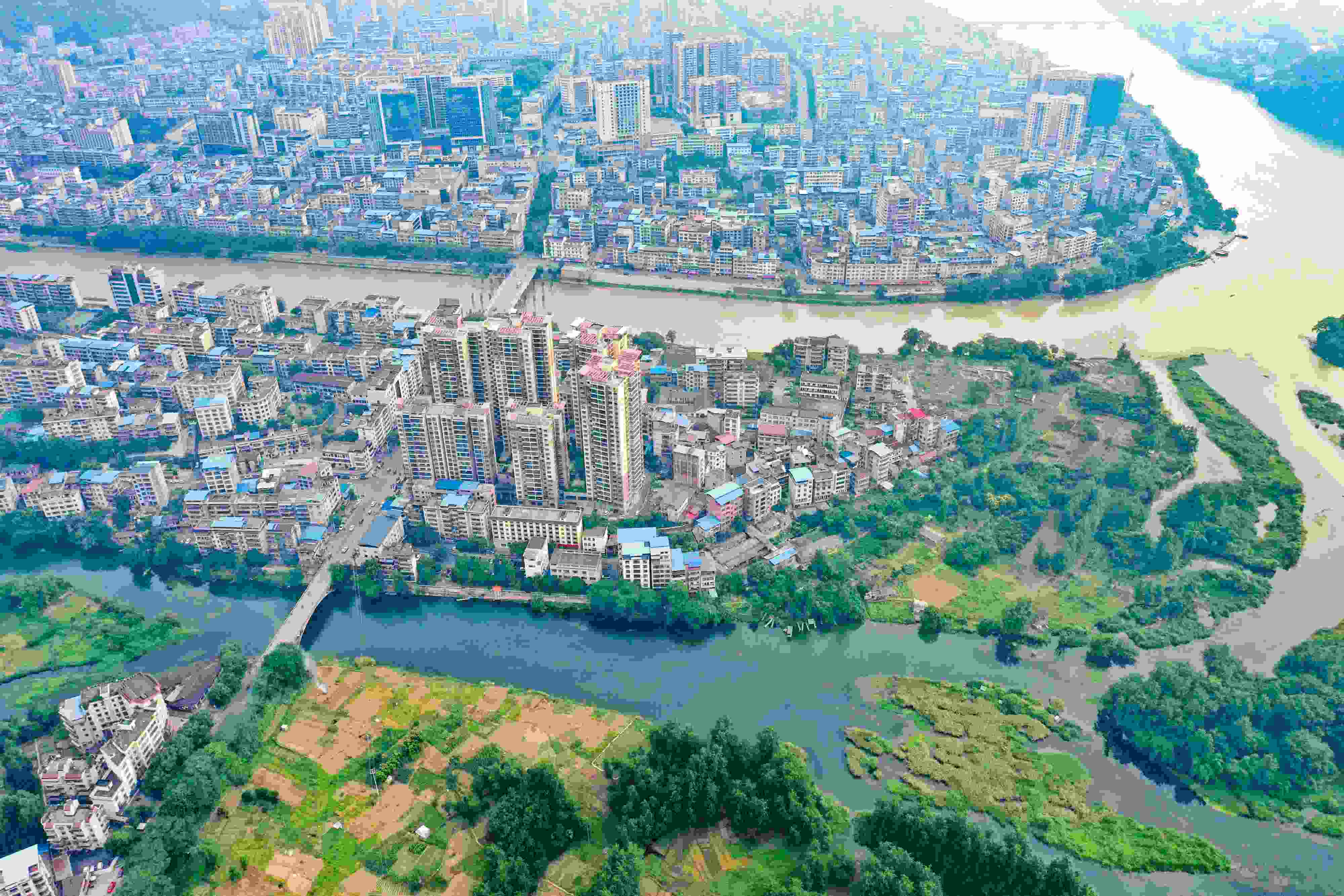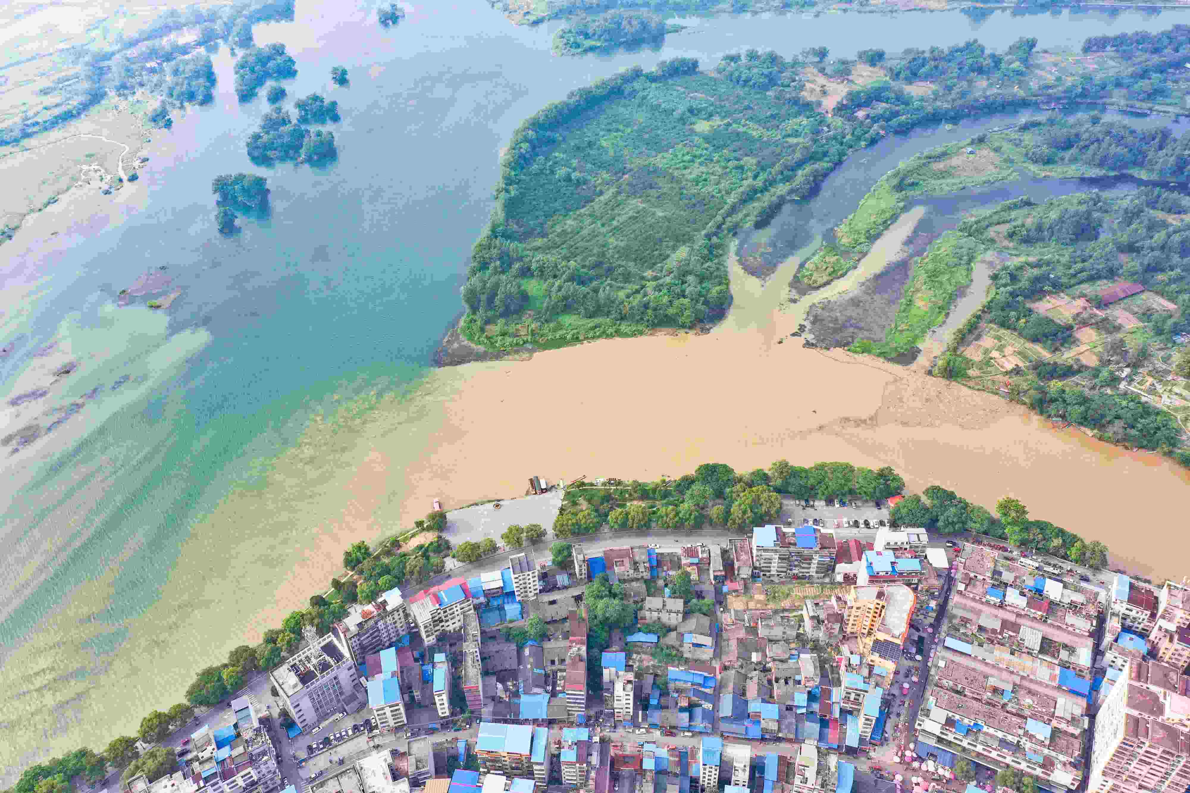 2023年6月4日,受降雨影響,廣西桂林全州縣城湘江河段出現(xiàn)涇渭分明景觀。空中俯瞰,湘江支流萬(wàn)鄉(xiāng)河混濁的河水繞城匯入清澈的湘江干流,交匯之處涇渭分明。 視覺(jué)中國(guó)