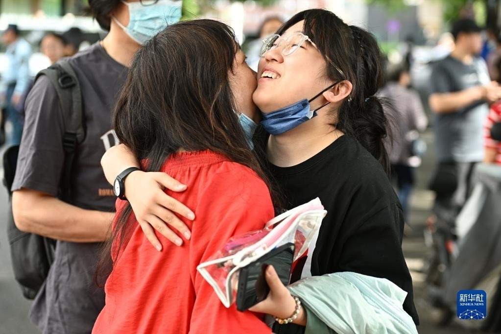 6月7日,在吉林省長(zhǎng)春市五十六中學(xué)考點(diǎn),考生入場(chǎng)前與家長(zhǎng)擁抱。   新華社記者 顏麟蘊(yùn) 攝