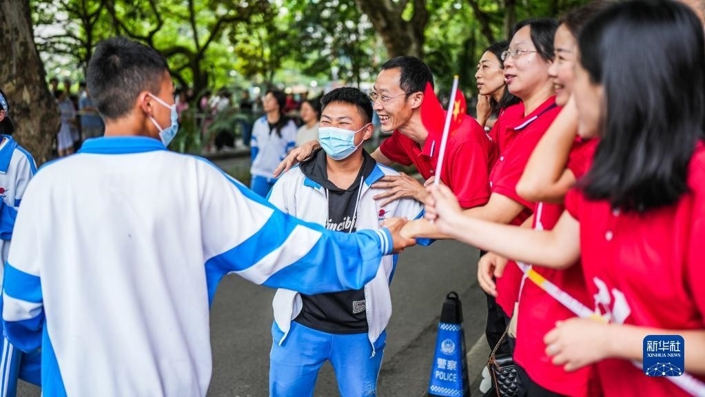 6月7日,在吉林省長(zhǎng)春市五十六中學(xué)考點(diǎn),考生入場(chǎng)前與送考老師擊掌。   新華社記者 顏麟蘊(yùn) 攝