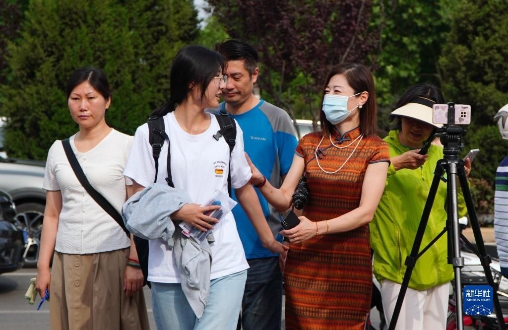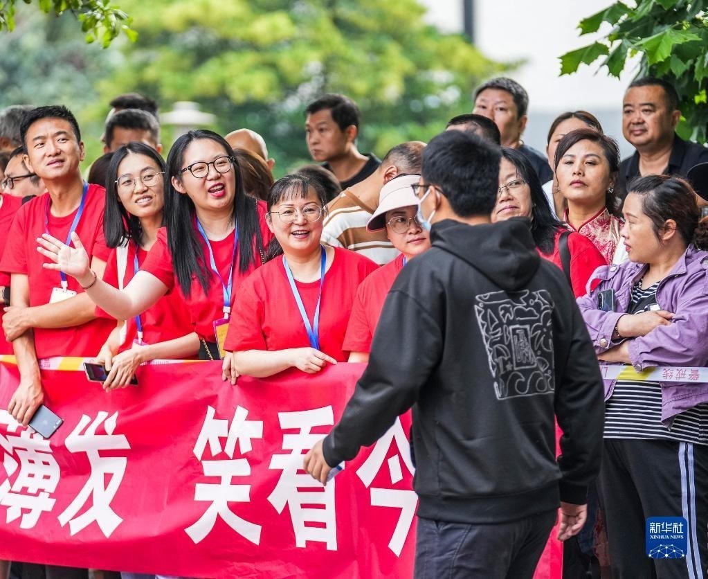 6月7日,在北京師范大學(xué)附屬實(shí)驗(yàn)中學(xué)考點(diǎn)門口,考生家長(zhǎng)給考生加油打氣。   新華社記者 李鑫 攝