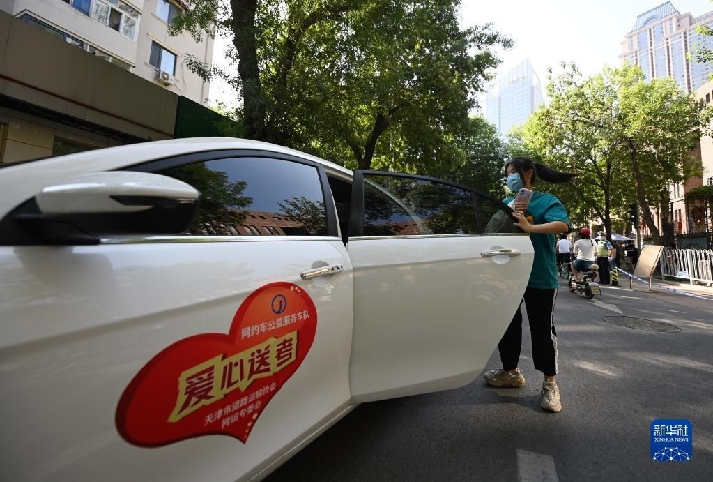 6月7日,在天津市耀華中學(xué)考點(diǎn)附近,考生從愛(ài)心送考車輛下車。   新華社記者 趙子碩 攝