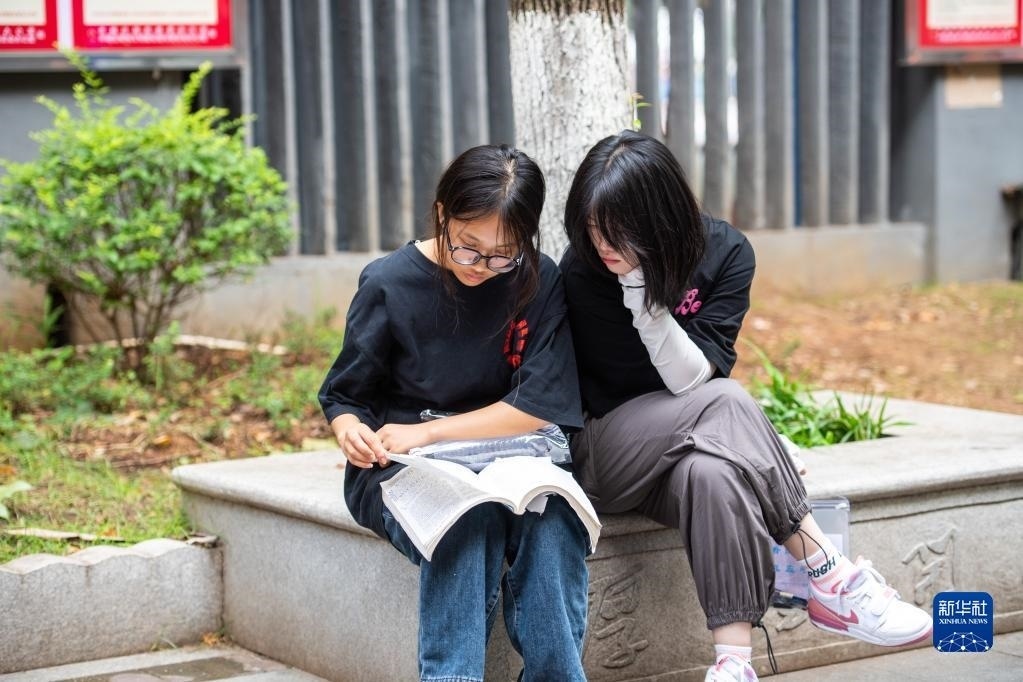 6月7日,在湖南長(zhǎng)沙市第一中學(xué)考點(diǎn),考生在考場(chǎng)外復(fù)習(xí)。   新華社記者陳思汗攝